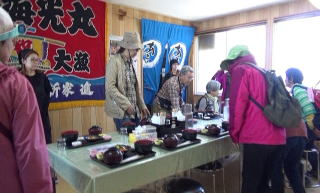礼文島の北の方は、2本の角のように突き出ていて。左側がスコトン岬、右側が金田岬。そこに、昼食会場「日本最北端の海の家」あとい食堂があった。 座敷の壁には、景気よく大漁旗がつるされていた。 |