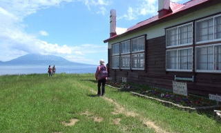 | 校庭からは、海越しに利尻富士が美しく見える。こじんまりとした校舎が、北の分校を彷彿とさせる。 さらに、抜群の天気が、その景色をベストのコンディションにしてくれていた。 |