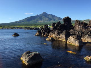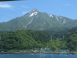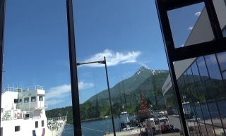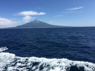 | 海上から見る利尻山は、まさに富士山。すそ野が広がっていく様は、海にぽっかり浮かぶ富士山だった。 我々にしてみれば、礼文島に向かう時も、礼文道からもしっかり見えていたので、見慣れた姿になっていたのだが、これだけ長い間くっきり見えることは珍しいのだそうだ。 港に入るときには、利尻山が迫ってくる感じがした。手前の林を貫く橋は自動車道路なのだろうか。 |