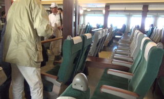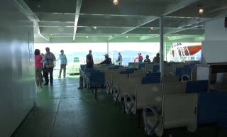 稚内から礼文島へ行くときには、絨毯スペースで座って過ごしたが、礼文から利尻へのフェリーは空いていたので、椅子席に座ることができた。 上の階に上がってみると、甲板の手前には、ベンチシートがあった。天気も良いので、ここでもよかったかな。 |