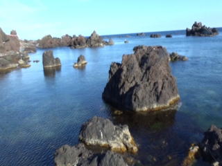 生け簀から南の方を見ると、岩がいくつも海中から突き出ていて、見ていても楽しい光景だった。 利尻の昆布を扱う有名な店があるということで、土産物のための立ち寄りかと思っていたが、 降りてみて、歩いてみて、立ち寄る価値は十分にあった。 |