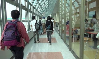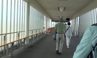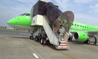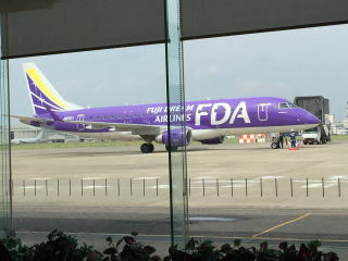 出発時刻の10分ほど前に、搭乗手続きが始まった。屋根付きの通路を進み、チェックを受けて外に出てから、歩いて飛行機に乗り込むのだった。 県営名古屋空港もFDAも初めての利用で、興味深かった。 |