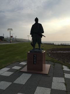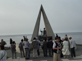 宗谷岬に向かう途中で、日本最北端の宗谷灯台が見えた。 バスを降りて、そこの寒さにびっくり。けっこう風がある。上着なしではがまんできない。それでも、寒くない方なのだそうだ。 宗谷岬のモニュメントでは、記念写真を撮る列ができていた。 その左横には、樺太探検に出た間宮林蔵の像があった。 |