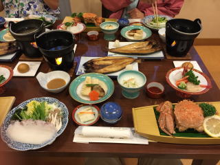 夕食の席に着いてびっくり。刺身はあるは、肉のしゃぶしゃぶはあるは、ホッケが丸々あるは…。とても食べきれない程だった。 風呂も温泉だった。 翌朝は、船に間に合わせるために朝の5時だった。外はすでに日はのぼり、すっかり明るくなっていた。 |