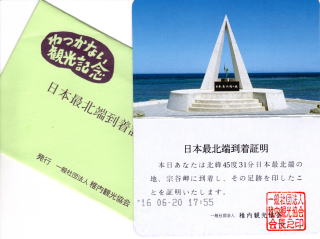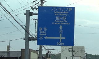 ドライブインには「日本最北端到着証明書」が売られていたが、今回の旅行には、この証明書もついていた。 さすが最北端の街、宗谷岬から宿に向かう途中の道路標示には、日本語のほかに、ローマ字、ロシア語の表記もあった。ガイドさんはこういうところをていねいに話してくれた。 |