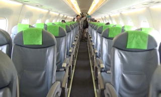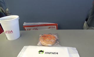 | 機内に入ると、シートの頭部には、機体と同じ色のカバーがかけてあり、2席2列のシートがさわやかな感じだった。天井もけっこう高い。 機内サービスは、ドリンクにゆうちいもの餡を使ったパイだった。なかなか気が利いている。 |
