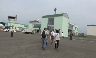 初めての稚内空港。小さいけれどもすっきりしたつくりだった。 今回利用したのはチャーター便だったが、FDAの機体も、空港のビルも、親しみが感じられた。 |