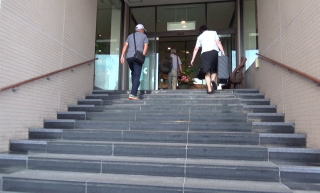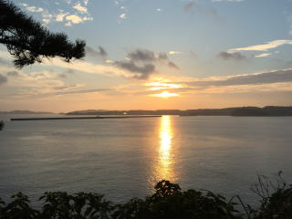 | 壱岐ビューホテルは、こじゃれたところだった。が、部屋のある5階の廊下は冷房が効いていなくて、むっとした感じだった。 宿のすぐ隣に「春一番の塔」と矢印があり、石段が小高いところに続いていた。日没も近く、夕日も眺められそうで上ってみた。 海面近くには雲があり、日没手前の景色を楽しんだ。 |