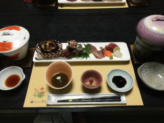 食事は、部屋でゆったりと。 島の宿だけに、ウニ、モズクをはじめとする海の幸がふんだんに出された。 |