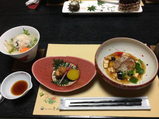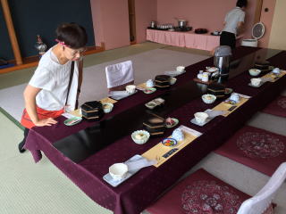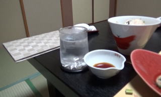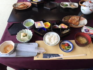 | 朝食は、3階のお座敷。 干物や豆腐など、純和風の料理を、落ち着いた雰囲気でいただいた。 |