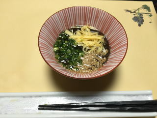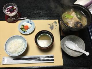 | もずくのうどんは食べやすかった。 最後の食事の時にh、味噌汁がコンロ付きの鉄鍋で出されたのにはびっくり。最後まで、手を抜かないおもてなしなのだ。 |