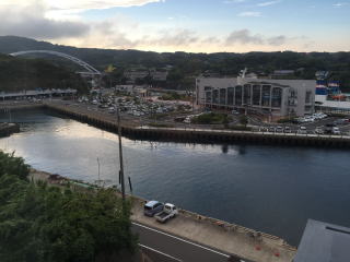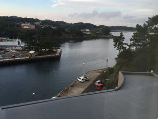 部屋からも、1階上の浴場からも、目の前に港が見え、天気も良くて眺めを楽しむことができた。 町の中心部や高校なども見ることができた。郷ノ浦の中心部は、左に見える橋の奥あたりにあるらしい。 |