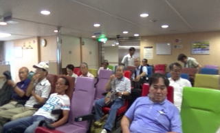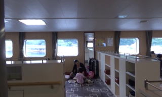 | 対馬から壱岐への移動は、フェリーだった。ジェットフォイルなら1時間ほどだが、フェリーだと2時間かかる。 フェリーには、絨毯敷きのフロアと椅子席がある。絨毯敷きの魅力もあるが、今回は椅子席にした。 |