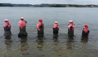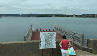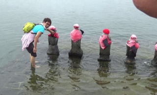腹のあたりに穴のある6体の地蔵が海に立っている。潮が引いたときには、そこにお賽銭を入れたりするのだとか。 潮が引いてないのに、水の中に入って、確かめに行った元気な人がいた。 |