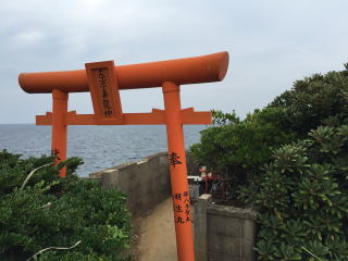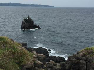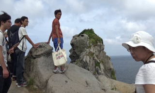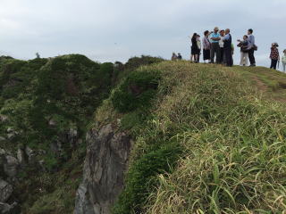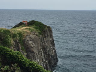 左の写真の赤い鳥居が見えますか。海に突き出た断崖の上にある祠です。 水平線が見えますが、玄界灘です。 グループの人たちが、平気で立っていますが、その先も断崖。ここには、手すりも防護柵もありません。 |