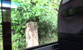 左側の小山から、猿岩を見ている人がいた。時間もあるとのことで、行って見ることにした。 お猿さんを左横から見ると、そちらはごつごつした岩で、完全なお猿さんではなかった。 はじめに見た方向から見るのが一番いいのだった。 |