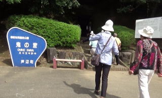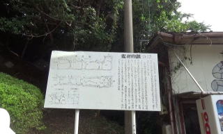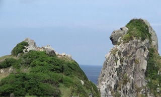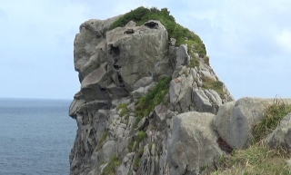 | 砲台への登り口のところで、海の方を見ると、まさにサルそっくりの岩がある。木々の緑が髪の毛にも見える。 ガイドさんは、この岩の写真を年賀状に使ったそうだ。 「いろいろなところに、「○岩」なんてのがあるけれど、この猿岩ほど似ているのはありませんよ」と言われてみれば、確かにそう思う。 |