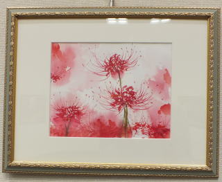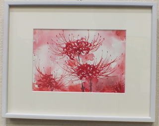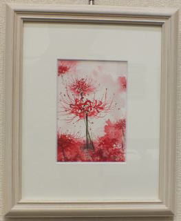 赤の濃淡で描かれた曼珠沙華 絵はがきにもなりそうであり、 どこかの部屋に飾りたい作品でもある。 花弁やがくのラインが美しい。 |