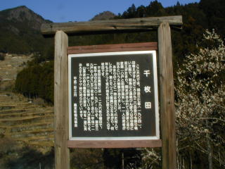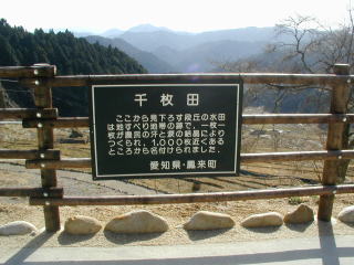 | The signboard says, Senmaida ( One thousand ricefields ) From here we can look down on nearly 1000 ricefields. They are on the slope made by a landslide. They were made by farmers' hard work. The name of Senmaida came from the number of the fields. |