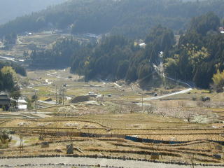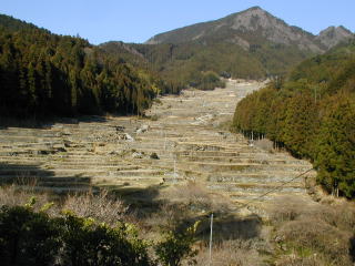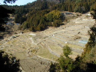 This signboard says, The Senmaida (The Thousand of Ricefields) In The Ohshiro district, we had much rain for about twenty days in 1904 ( 37th of the Meiji period ). A cruel accident happend. Mud gathered and made a dam, then the water overflowed and carried away ten houses, fields and ten people perished. The villagers didn't know what to do after. But they began to made the thousand ricefields by using hoes and carrying bags knitted rice grass in many years. Actually there were 1,296 ricefields. The average size of one is 90 square meters. Now 39 farmers use 850 fields. One farmer cultivats 62 fields at most. The victims of the landslide are burred in the Kashage pass from where we can see the whole of the village. March 1990, by the Houraicho Sightseeing Society |