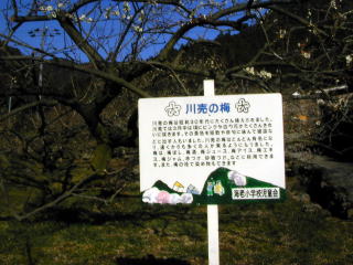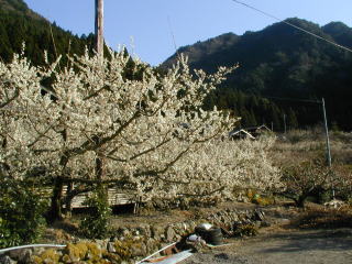 | Plums of Kaore These plum trees were planted in 1960's ( the 30's of the Showa pereod ). Pink and white brossoms bloom in the middle of March. Sometimes the beautiful scene was presented in short Japanese poems ( Tanka and Haiku ). The number of visitor began to increase. They came from near and far. Plum jam, plum juice, Umeboshi ( salted plum ), and plum liqueur are all made from plum fruit. And the branches of the plum tree used as cloth dyestaff. Pupils staff of Ebi elementary school |
