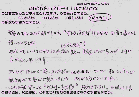 園からの返答・・アンケートありがとうございました。担任による撮影は、な かなか好評でした。乳児さんだと、僕がカメラを担いでいくとどうしてもいつも の表情がとれません。これからも、出来るだけ先生に撮ってもらう予定です。ひ ろえ先生は僕よりカメラワークがよかったと思いますよ。これからもずーと「げ んきっ子ビデオ」を続けていきますので、こちらこそよろしくお願いします。