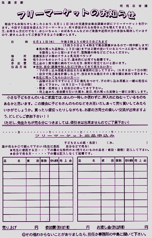 平成5年から始まったフリーマーケット。現在は、多くのお母さん方を始め地域の方々・老人クラブのみなさん方の参加があり、4日間の開催となっています。