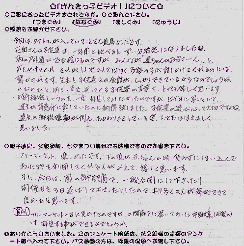 園からの返答 アンケートありがとうございました。 入園当初は、なかなか自分が出せなかった達ちゃん、この頃は元気いっぱいに自分を表現できるようになりました。 ギャング時代ともいわれる4歳児、思いっきり暴れさせてあげてください。 フリーマーケットは、年々出品してくれるお母さんが増えて、今年は100人以上が参加してくださいました。 来年も3日間やる予定なのでまた、出店してください。 2階の卒園文集は、いつ見てもらっても結構です。 僕も、毎年これを読むのを楽しみにしています。