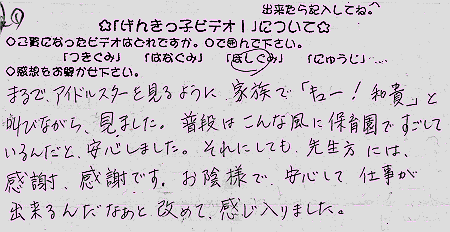 アンケートありごとうございました。 お母さんの「げんきっ子ビデオ」の見方は正しい見方です。 いつまでも和貴くんの応援団であり続けてください。