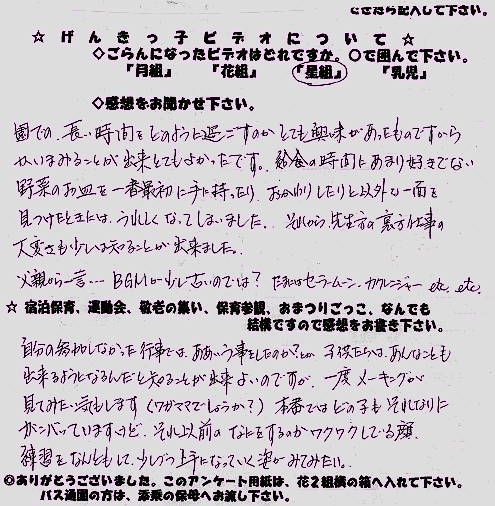 園からの返答 アンケートありがとうございました。 子どもって本当に園の顔と家の顔があるんですよね。これは、 表裏があるわけでなく、どちらも本当の姿なんです。 みんなとがんばっていたかたと思えば、お母さんに甘えてしまう。 園での姿、家での姿、どちらも大切にしてあげて下さい。 運動会は、練習風景がとれませんでしたが、遊戯会は、たっぷりと練習風景が入ります。 ご期待下さい。BGMは、次に期待していて下さい。