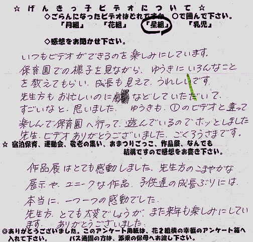 園からの返答 アンケートありがとうございました。 先生たちで話し合った今年の作品展のテーマは、「子どもの作品、一つ一つを大切にしよう」でした。 ただ単に、成長順に並べるだけでなく、どういう思いで描いたのか作ったのかが伝わるように工夫しました。 絵の下に張ってあった、子どものつぶやきもその一つでした。 単なる丸が、この子にとってどんな意味を持っていたのかが分かってもらえたのではないかと思います。 あらためて、子どもの作品っておもしろいですね。