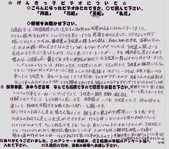 先生の狼のことですが、「三匹の子ぶた」は、お誕生会の出し物(雪組)で、子どもたちが大変盛り上がって、その後もごっこあそびが続いていたために、先生たちで話し合って遊戯会にもってきました。 ごっこあそびでは狼役を先生がやって、その迫真の演技に子どもたちが喜んで逃げまどうというパターンでしたので、そのままでいこうと言うことになりました。 先生が目立ちすぎという意見もあると思いますが、普段の様子を見ている僕たちとしては、あれで良かったんじゃないかと思っています。