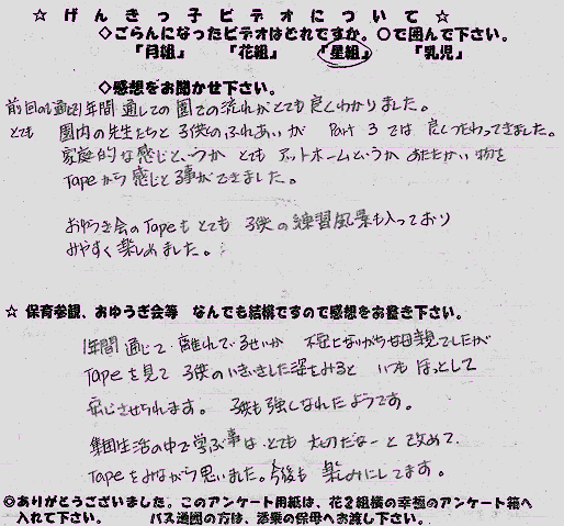 園からの返答 アンケートありがとうございました。 一人で遊ぶより、二人で遊んだ方がおもしろい、みんなで遊べばもっと面白い。 園では、集団生活の良さを教えていくと同時に、その中で、一人一人を大切に見つめていきたいと思います。