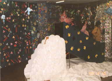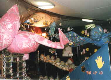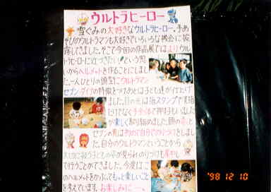 天井からは、2歳児さんが作った怪鳥ロプロスが ウルトラマンをねらっています。 このロプロス、今でも2歳児さんのお部屋の上を飛んでいます。 |