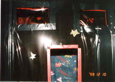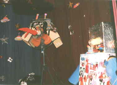 ロケットの中をくぐり抜けると、いよいよ宇宙空間へ! 窓からは年中さんの製作が流れ星のように見えます。 いい味だしていました。 |