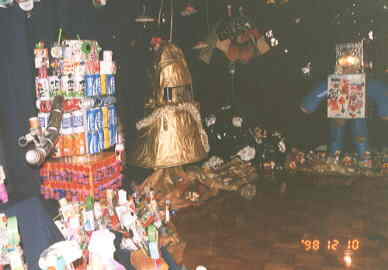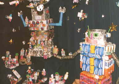 | 年中さんが作ったロボットたち。 作った本人たちもここに来ると、 「ロボットがしゃべっている、しゃべっている!」と大騒ぎ。 このロボットたち、今度はお遊戯会にも出演するようです。 中に子どもが入ることも出来るんですよ。 |