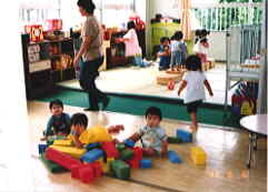 | 2階、0.1歳児のお部屋です。 | 1階、月1組(年長)のお部屋 あそぶ時は、おもに机を使うあそびになります。 |