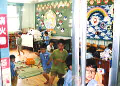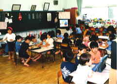 | 年長・年中児には、6台の幼児用コンピューターが 自由に使えるようになっています。コンピューターを 特別視せず、ブロックや折り紙と同じあそびと 考えています。 |