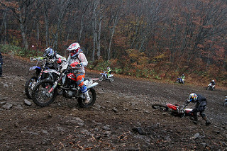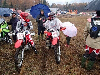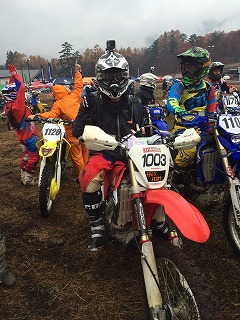[遥かなる爺ケ岳6]('15/11.22) 早いもので、今シーズンも最終戦の爺ヶ岳ラウンド(AAGP)がやってきた。 この最終戦には、「選抜ワイルドクロス(地域対抗のクロスカントリーレースみたいなもの)」というおまけもついている。 昨年は、ショウゴがCOMP枠、タカがFUN枠、そして父ちゃんがレジェンド枠(50歳以上)で選抜されたのにも関わらず、 土曜日が保育園の行事と重なってしまい出られなかったんだな。 そして、今年もありましたよ!選抜ワイルドクロス。 今回もJNCC代表のホシノさんから電話が掛かってきた。 しかし、選ばれたのは、COMP枠のショウゴのみ。 ほとんど出ていないタカは、当然としても(笑) この生きる伝説!と恐れられている父ちゃんも選ばれなかった・・。 (生きるおバカ伝説でしょ!by母ちゃん) まぁ、今年は昨年のような7人の選抜枠から5人になってしまい、 レジェンド枠もなくなってしまったので、当然と言えば当然の結果なのだが・・。 東海地域の選抜は、次の通り。 選抜「東海-A」・(静岡-A)・ 近藤香織(WA)・澤入正和(FB)・神馬 健(FA)・.山本浩史(AA1)・鈴木健二(AA1) 選抜「東海-B」・(静岡-B)・ 大田晴美(WA)・辻 夏希(FB)・/.小栗伸幸(FA)星野恭平(AA1)・内山裕太郎(AA1) 選抜「東海-C」・(愛知・三重)・菅原悠花(WA)・福森寿明(FA) .伊藤史朗(FA)中島章悟(A)・・・.榎田諒介 (AA2) 父ちゃんたちの(愛知・三重)のFA枠2人は、フクモリさん(ゼッケン10)とイトウさん(ゼッケン11)。 今シーズンの父ちゃんのゼッケンが12番なので、昨年のFUN-Aクラスのランキングが3人並んでいるんだな。 と言っても前の二人とのスピード差は明らかで、FreeRide250(通称テンちゃん!)に替えた今シーズンは、 ラップタイムでも1分以上は毎回離されている悲しい現実がある。 (今シーズンの最終ランキングは、イトウさんが4位、フクモリさんが6位、父ちゃんが8位だった!) 今回は、母ちゃんも応援に来てくれるので、張り切っていたのだが、みんなの応援に切り替えよう! いつものようにタカが着くのは、土曜日の夜遅く。 今回は、東京での学会が終わってからの爺ヶ岳入りなので、松本駅まで迎えに行った。 ナホこそいないが、久々に4人そろってテンションアップ! 「待っていろよ、爺ヶ岳!」と男たち三人は、燃えていたのだった!! 【JNCC 第8戦】最終戦での大逆転、渡辺学がタイトル死守 [Response.15より] 東洋最大のクロスカントリーシリーズである、 JNCCの最終戦は、ファンにはおなじみの名トラックである爺ヶ岳スキー場にて開催。 「AAGP」と呼ばれ、国際大会としての側面も持つ。 今大会では、国際大会ならではのユニークな顔ぶれが登場。 本場アメリカのGNCCからは、正式にGNCCから派遣されたC・バック、 そして個人的にJNCCへ参戦した世界的なトップライダーJ・ストラング、 またオーストラリアから昨年に続いてK・アンダーソンが来日した。 排 気量無制限のトップクラスであるAA1においては、最終戦までタイトル争いがもつれ込み、 これまで4連勝の鈴木健二と開幕から3連勝だった渡辺学の2名に 注目が集まった。 鈴木に関して言えば、この最終戦にあたって自らが開発に関わったYZ450FXをデビューさせるという檜舞台でもあった。 当日の夜明けから、しとしとと雨が降り続け、トラックはマディに。 レースは、鈴木がスタートからマシントラブルで10分ほどのロス。 また、渡辺学も大きく出 遅れて鈴木ほどではないにせよ最後尾スタートを強いられる。 オープニングラップから、外国勢の圧倒がはじまり、ストラング、バックの2名が3位以下を大き く離してランデブー走行を続ける。 3番手は、ここぞとばかりに矢野和都が躍り出た。 渡辺は「とにかくチャンピオンを意識していたので、 (鈴木)健二さんだけを気にかけていました。 毎周健二さんとの差をピットで教えてもらって、余裕をもちながらレースを続けた」と語るとおり。 ただ、持ち前 のスピードから結局のところストラング、バックから大きく離れつつも3位でのフィニッシュとなり、チャンピオンを獲得した。 1位はストラング、2位はバッ クという結果。 《稲垣 正倫》 まずは、土曜日の選抜ワイルドクロス。 この時は、まだ雨も降っておらずベストコンディション! JNCCのような個人競技と違い、こういう地域対抗リレーもなかなか良いものですよ。 「東海C」の1番手は、ユカちゃん。 現在のWAクラスのランキング1位ですぜ! 2位のカオリちゃんは、今回は「東海A」での出場だぞ。 今年は、選抜13チームに、クラブチームが8チームの合計21チームでの争い。 スタートすれば、予想通りにユカちゃんが独走。 それにしても速い! 2番手のフクモリさんと交代するころには、2位に2分近く差をつけている。 2番手のフクモリさん、3番手のイトウさんも速く、4番手のショウゴにタッチするころの差は2分半近く。 この差をショウゴとリョウスケで果たして守り切れるか? というのも、2番手を走っている「東海A」のCOMP枠二人は、AA1クラスのヤマモトくんとケンジカントク! 言っちゃ悪いが、ショウ