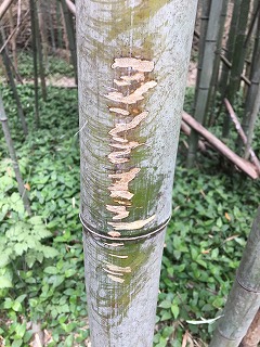 (ハンドルが当たった痕跡!こんなになった竹が竹やぶの中にはあちこちにあります)