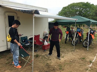 バイクが三台なので、車三台分のスペースをもらえて、サイドオーニングにテントまで設置。