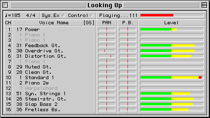 Club MID is an application for the Macintosh which allows you to play standard MIDI files. One window holds one standard MIDI file, and displays it's current tempo, System Exclusive status, Control Change status and Voice Name, Panpot, Pitch Bend, Level for each MIDI channel.