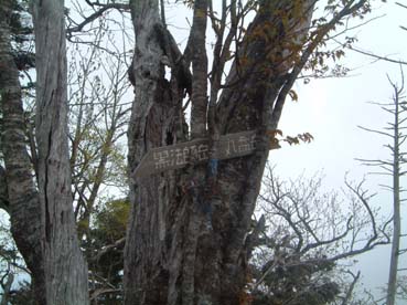 ピーク分岐の巨木の前後に新旧の看板が設置してある。降り口に倒木があり休みに丁度いい感じだった。