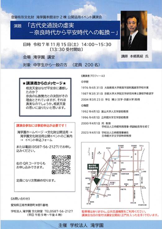6 「古代史通説の虚実―奈良時代から平安時代への転換―」11月15日14時から滝学園講堂