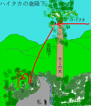 冬場は雑木林の上空で頻繁に急降下を繰り返し、小鳥の狩りをしているハイタカですが、原生林の深い山中で急降下するところを見ました。1996年5月3日、段戸山裏谷原生林の林道で小鳥類を観察中、北のほうから飛んできたハイタカが私の近くのモミの巨木の枝にとまりました。のんびりとしている様子をしばらく見ていたら、突然、伊良湖岬の先端でヒヨドリを狙うハヤブサのように急降下しました。翼をすぼめて紡錘形というか逆三角形になっての降下です。地面にぶつからずによく飛べるものだな…と思うほどのスピードでした。地上ぎりぎりの高さでホオジロくらいの大きさの小鳥を捕え、フワッと枝にとまりました。すぐ目の前の出来事でしたのでよけいにスピードを感じてしまったのでしょうが、でも、かなりの速度でした。そして枝の上で羽をむしって食べ始めました。