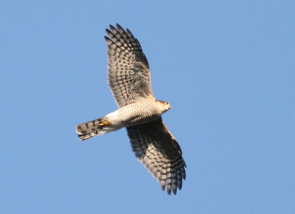 上の写真は2007年11月3日に愛知県内にて観察、撮影したものです。確かにハイタカなのですが、