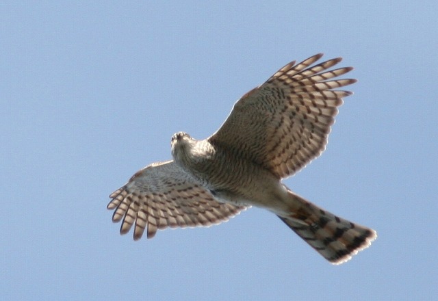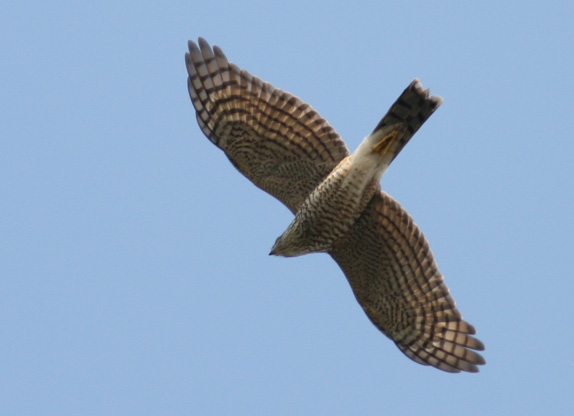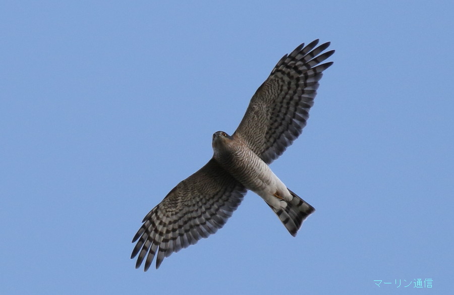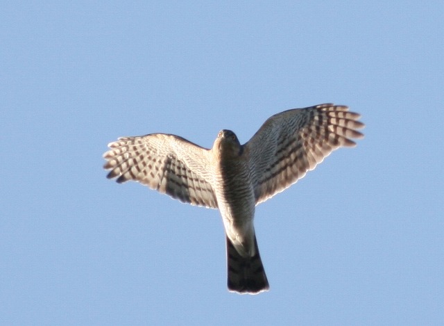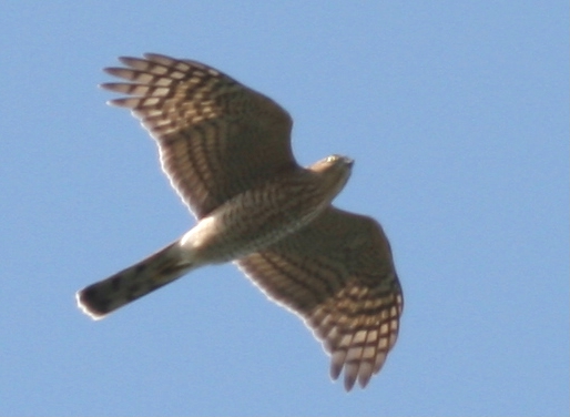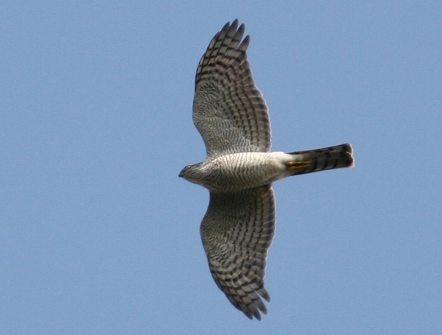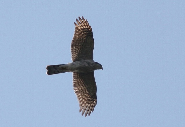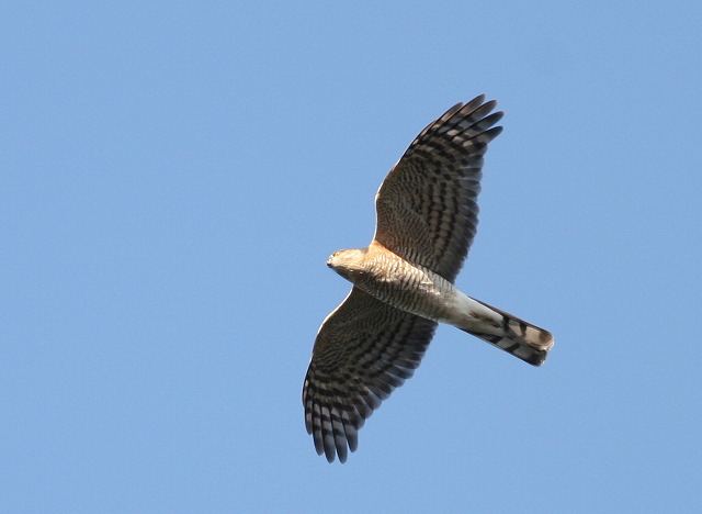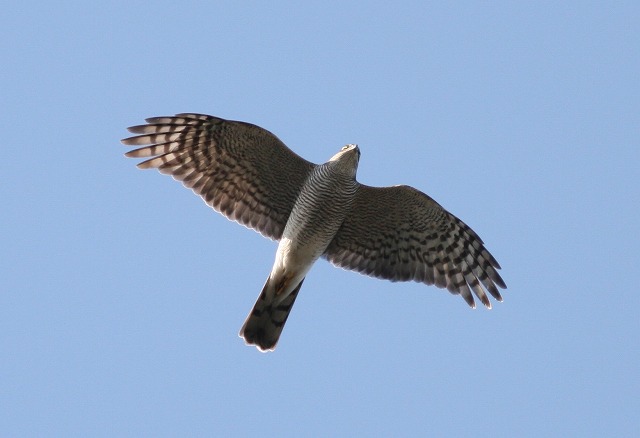 「う~ん、100%ハイタカだと確信していたのにツミだったとは……」と一人うなって、識別にちょっと自信をなくしてしまいました。「えーっ? これをツミだと言われてしまうと、困るなぁー」というのが本音でした。高度がやや高いとはいうものの、こんなにじっくりとほぼ真下から双眼鏡で見ることができたにもかかわらず、ツミとハイタカを間違えるとは……。歳のせいか、疲れがあるのか、ボケちゃったのか、いったいどうしたのか……。