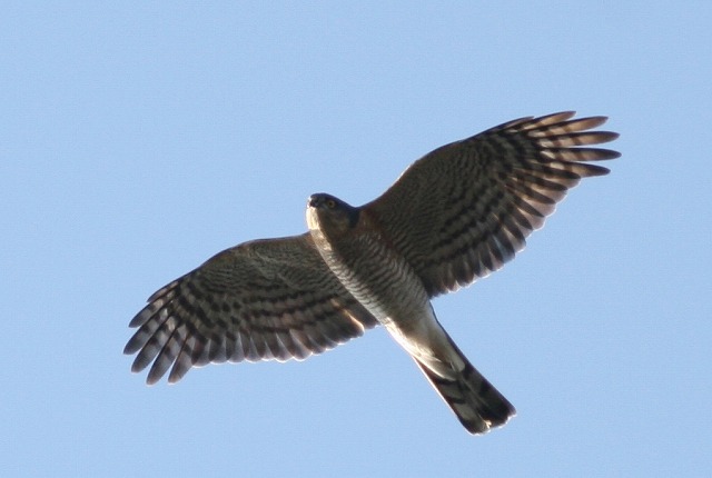 先日の(05年)10月23日、瀬戸市定光寺で、東からやってきたツミと西からやってきたハイタカが同じ場所で上昇気流を捉え、連星のように(主星がハイタカで、伴星がツミ)旋回上昇し、十分に高度をとったところでツミは西へ、ハイタカは東へと、正反対にスーッと滑空しながら渡っていきました。本当は西行き個体か東行き個体かという渡りの向きは正確には判断できないはずですが、ダイナミックな渡りの立体感とスケールの大きさを感じることができました。