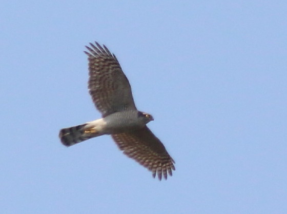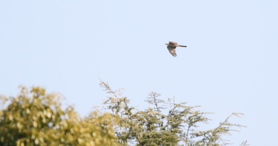 変わったハイタカ属のタカが1羽出ました。双眼鏡で見ていたら飛んでいる時のシルエットとヒラヒラとした感じ、遠くの林の上まで飛去した後に急降下して林の向こうに消えた様子などから、自信をもってハイタカだと思いました。ところが、400mmレンズで撮影した画像をカメラの液晶画面でとりあえず2カット見たところ、翼先突出が5枚で、虹彩には若干ながら赤味(だいだい味)がありました。