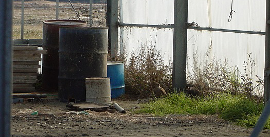 ノスリ、チュウヒ、ハイイロチュウヒ♂A、ハイタカ♀J、コチョウゲンボウ♀ or J、トビを見て、9時50分。一休みをするために、スズメ200羽くらいの群れの近くに車を止めました。運がよければ、コチョウゲンボウがスズメの群れに突っ込まないかな、または、塀の死角を利用してオオタカが隠密接近をしてフワッと上から突っ込まないかな、などと勝手な期待をしながら待つことにしました。すると、なんとラッキーなことに、その5分後(たった5分後です!)、9時55分に、アスファルト上の小さな水たまりで水浴びを始めたばかりの数羽のスズメに、タカが右から左へ、弾丸のように、低い角度で突っ込みました。肉眼で見ていましたので、コチョウゲンボウにしては大きいなと思いましたが、ハイタカという選択肢はこの時は頭になく、アレレ?という感じでした。スズメを足につかんで、下の写真のように、クイックターンで倉庫の中へ、開いた窓から入って戻っていきました。この間、ほんの5~6秒でした(実際はもっと短い時間か?)。